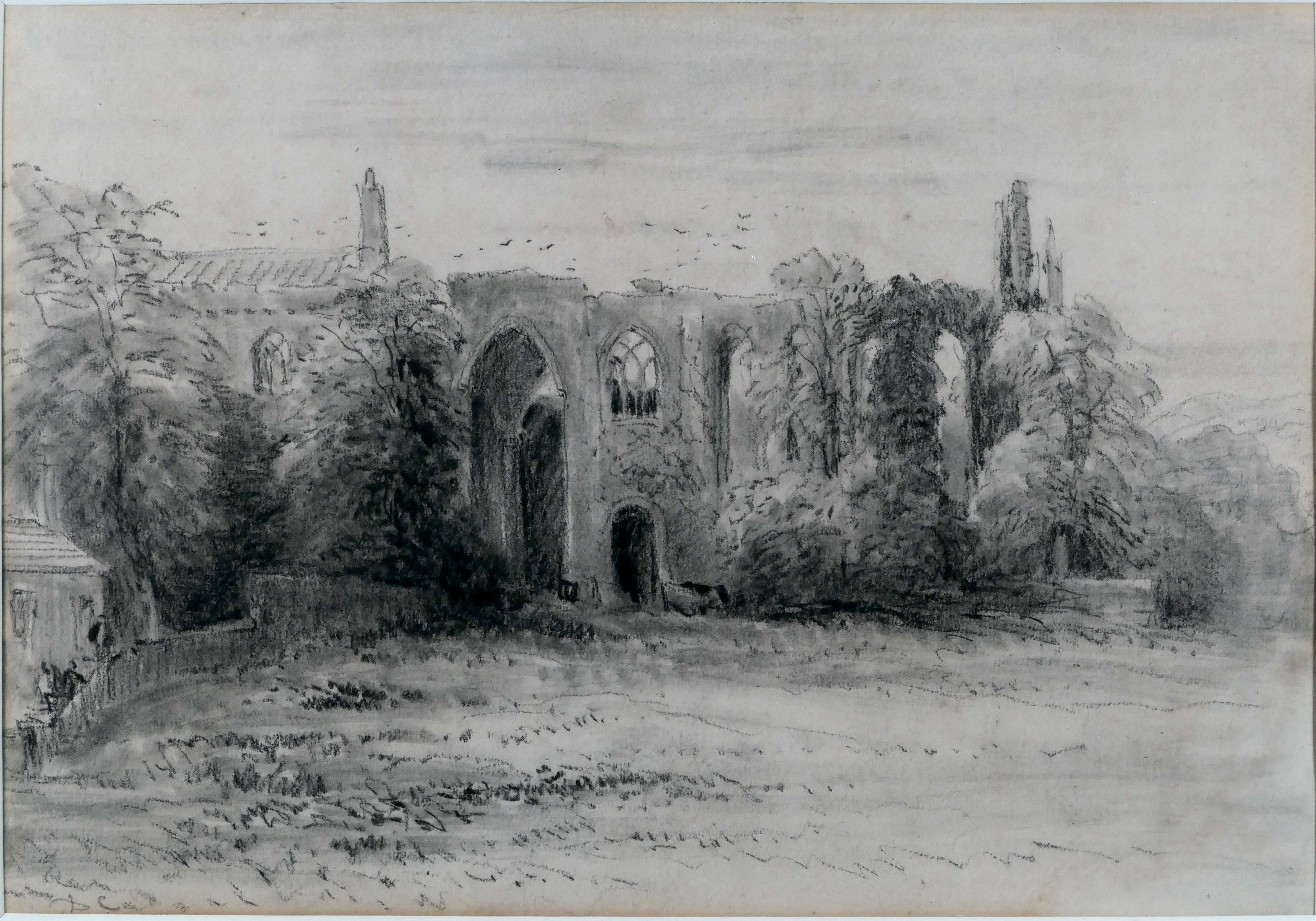 This view has not changed much since Cox drew it on one of his many visits to Bolton Abbey, often while staying at the Devonshire Arms at Bolton Bridge. Buildings still stand on the left of this scene, and a wall runs from them towards the Abbey, which is no longer partly shielded by trees. On the reverse is a chalk and watercolour study of trees and the River Wharf, probably close to the Abbey, indicating that this is a sheet from a sketchbook. While that study is relatively unresolved, Cox has indicated that the present work amounts to a finished drawing by initially it D.C. in the lower left corner.