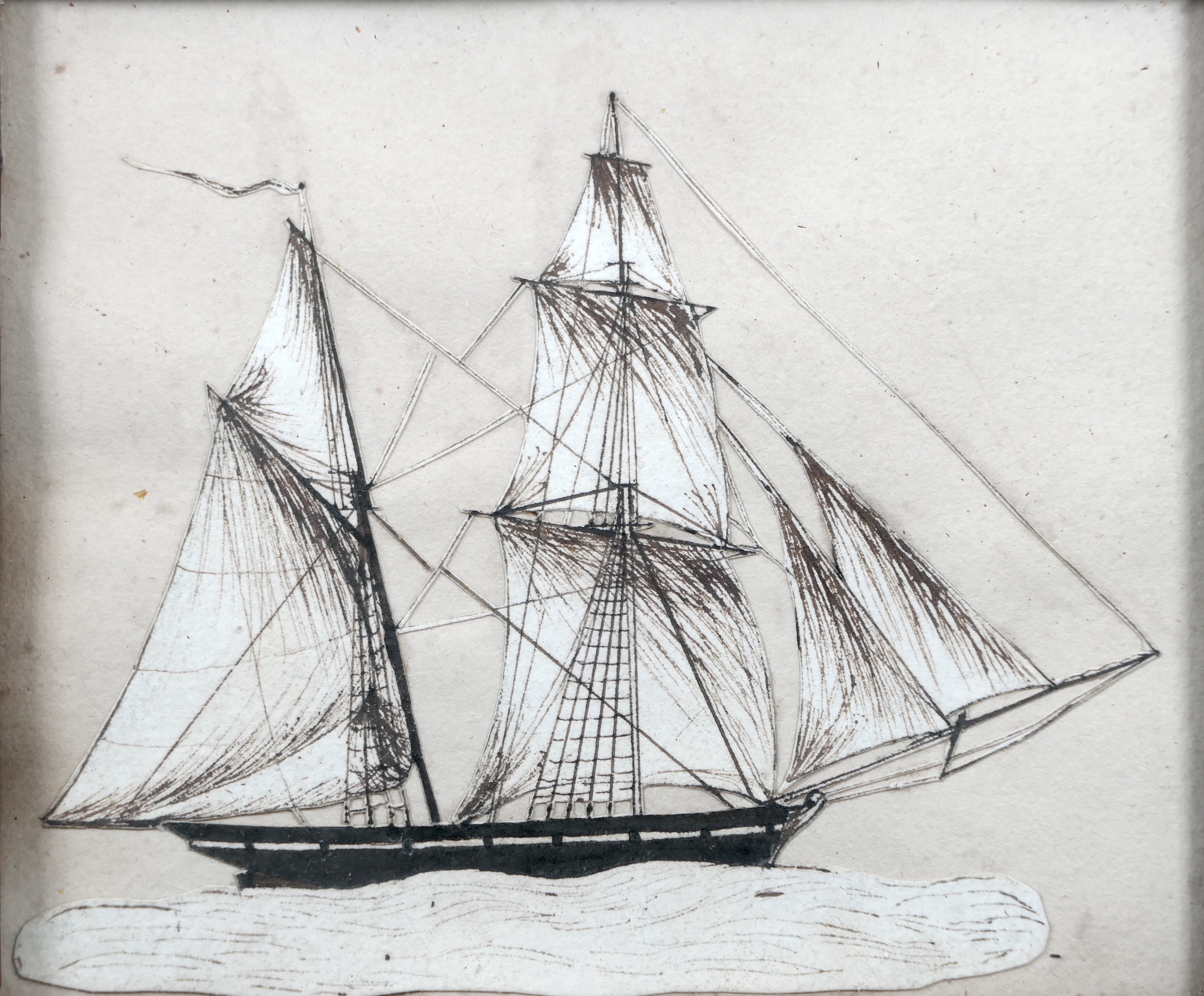 This naïve study of a sailing ship is reminiscent of the ship portraits popular in the early 19th century. While ship portraits in oils and watercolour would typically have been made for ship owners and captains, this more modest paper cut-out may have been made by or for an ordinary crew member.