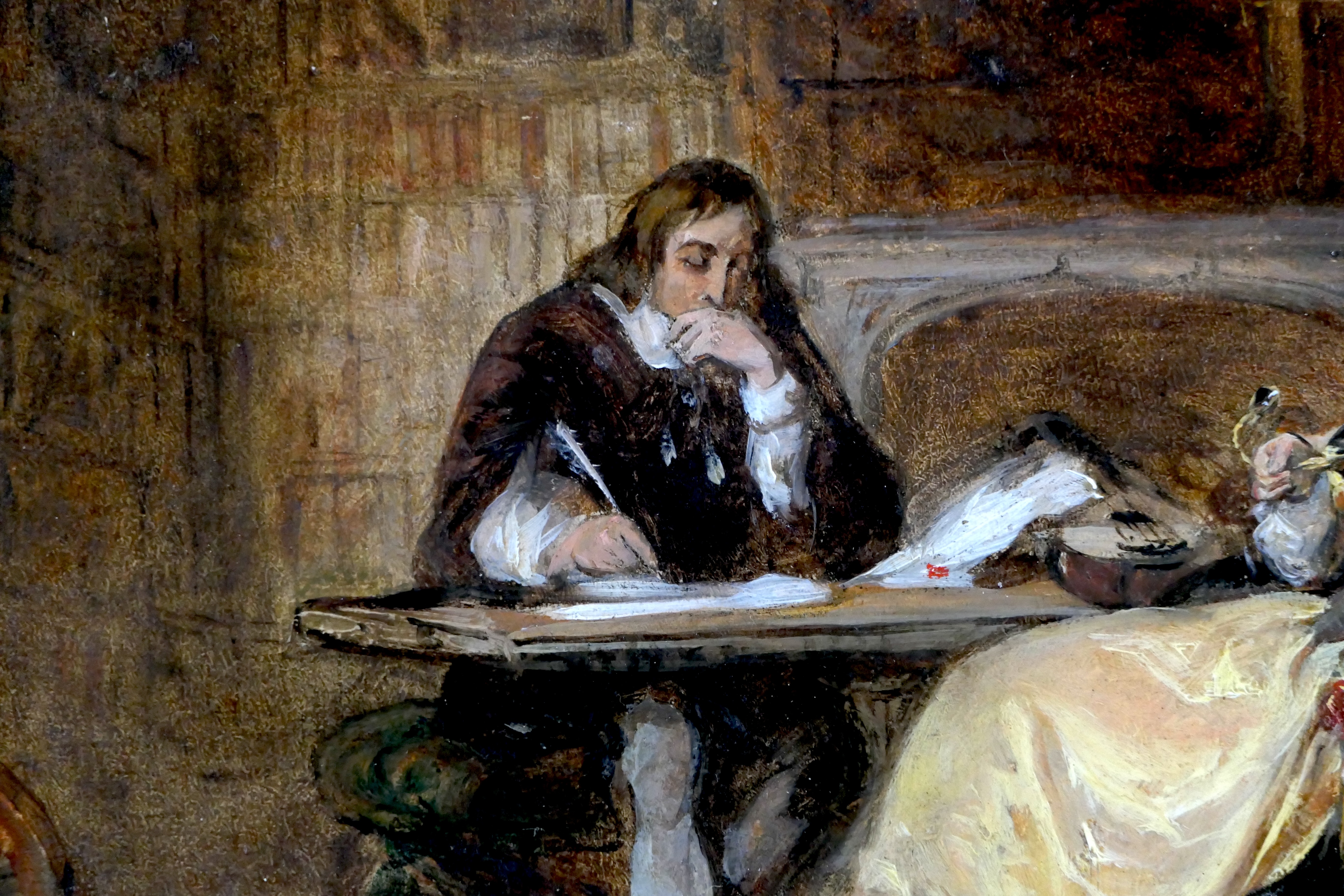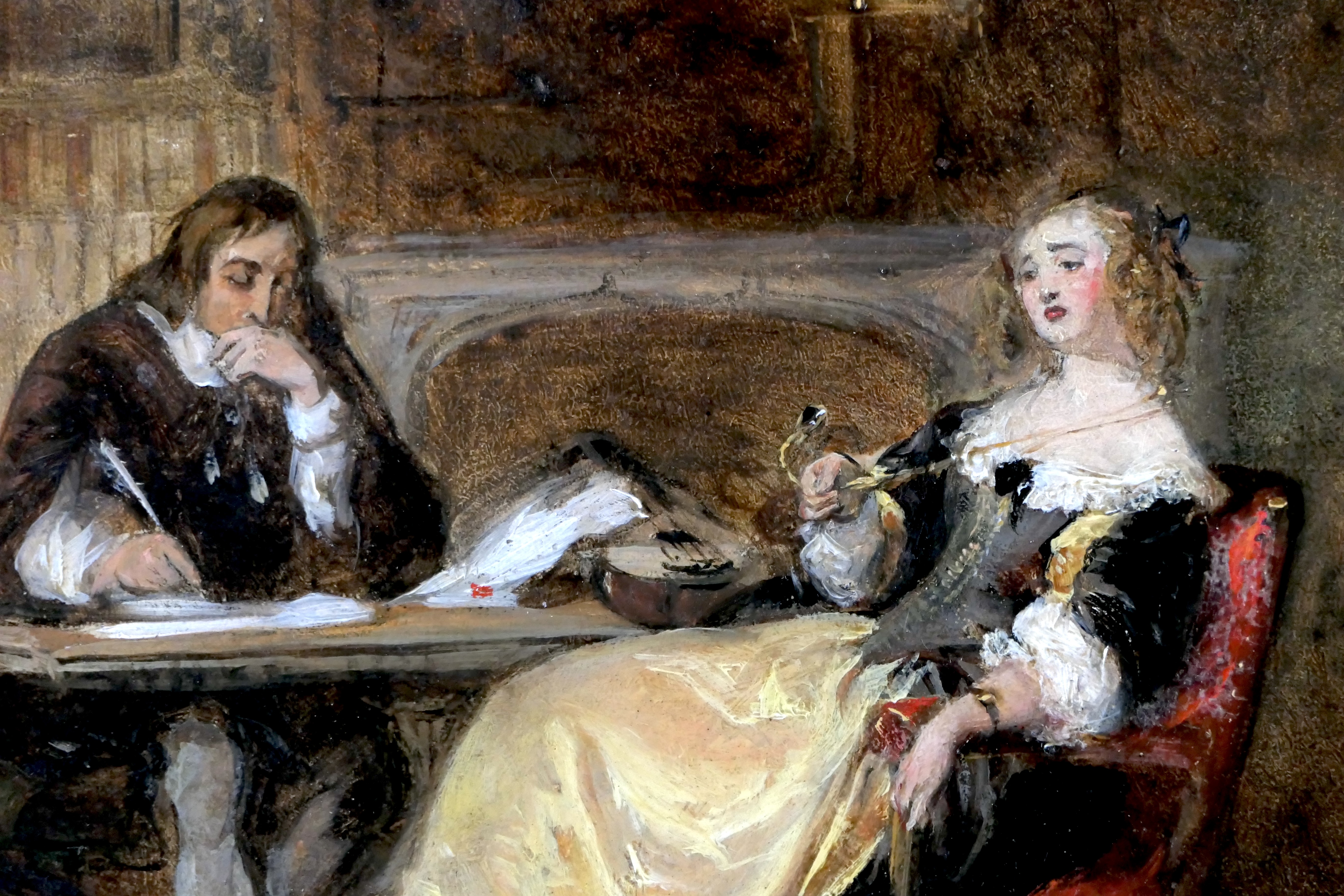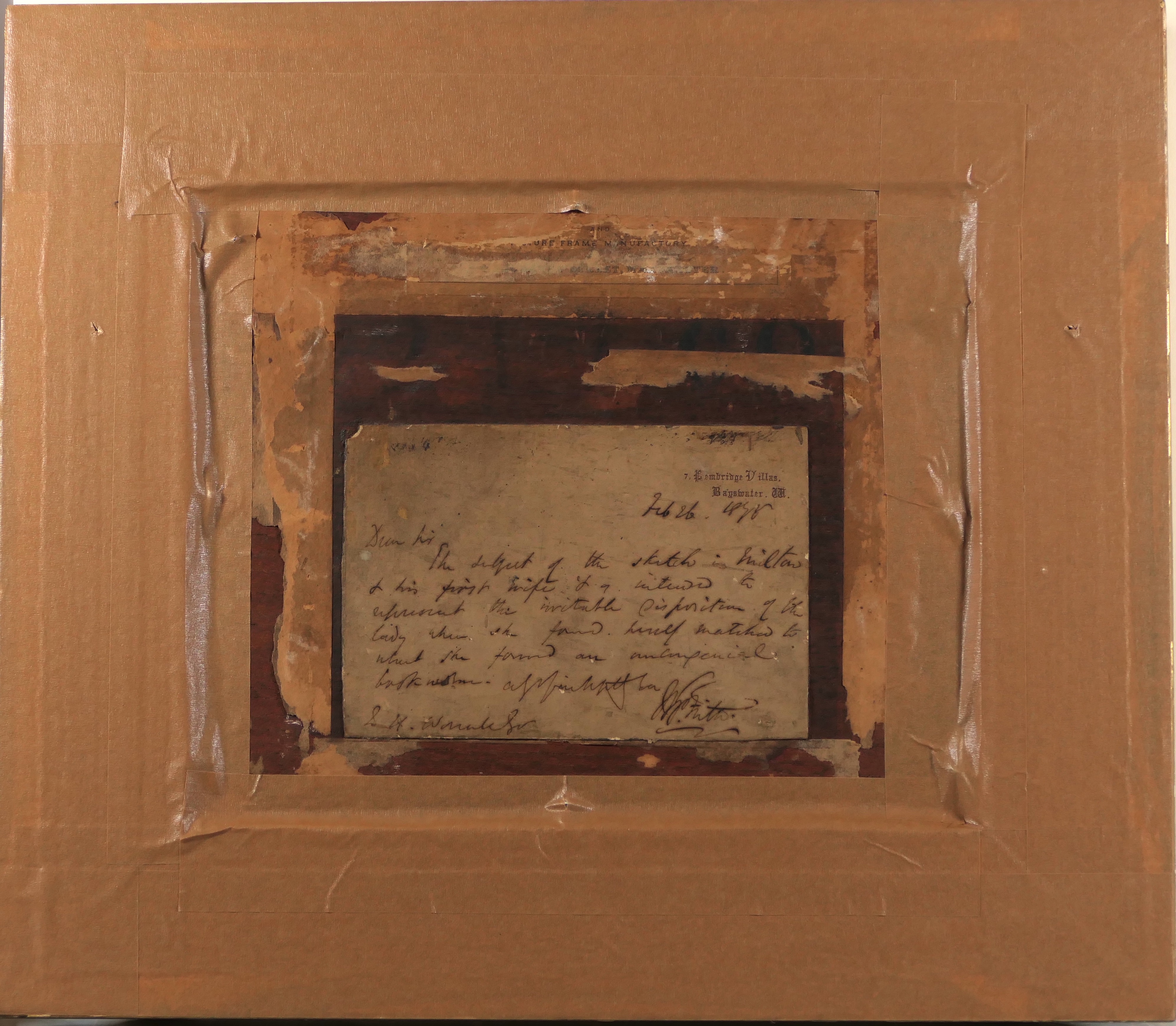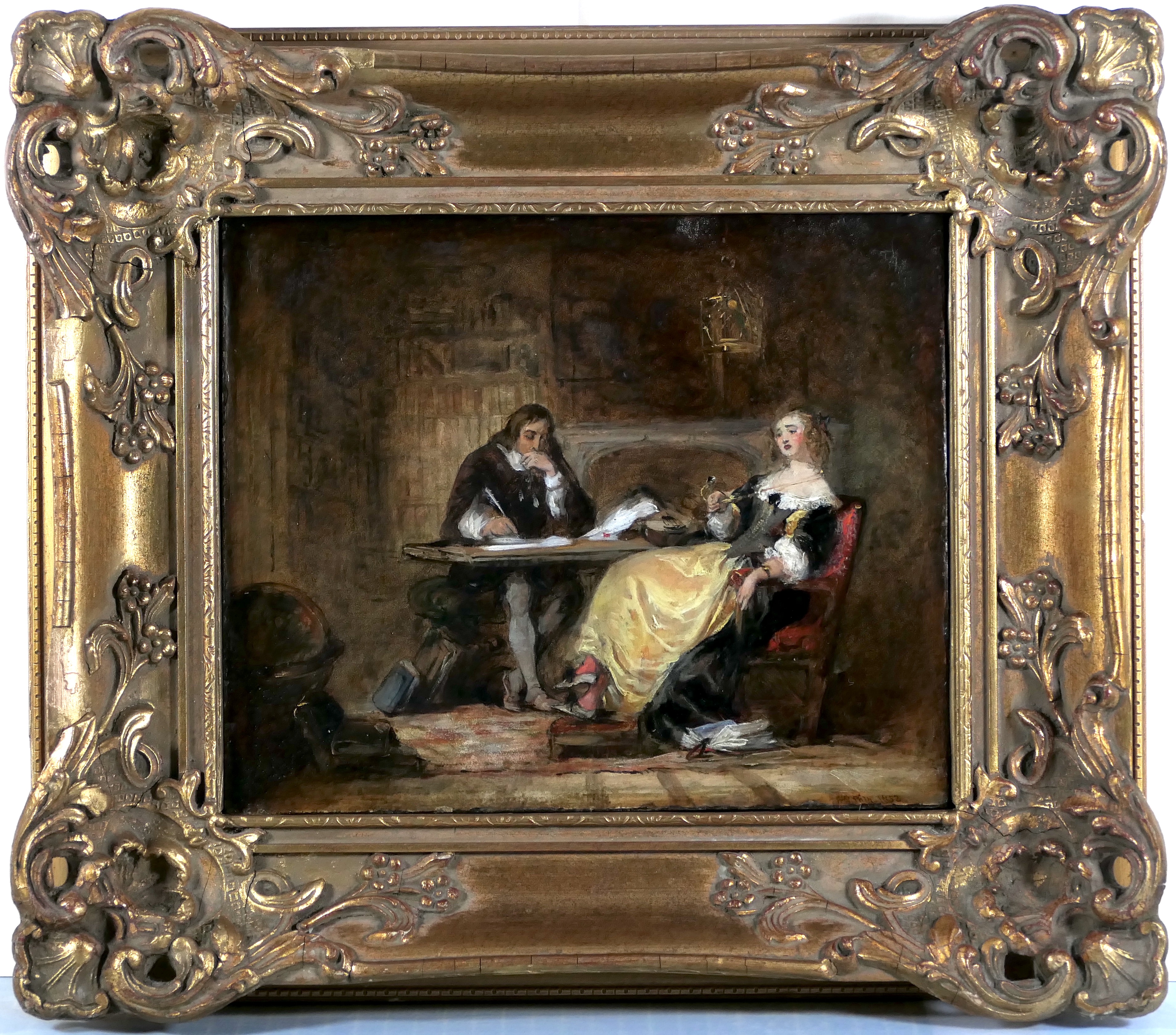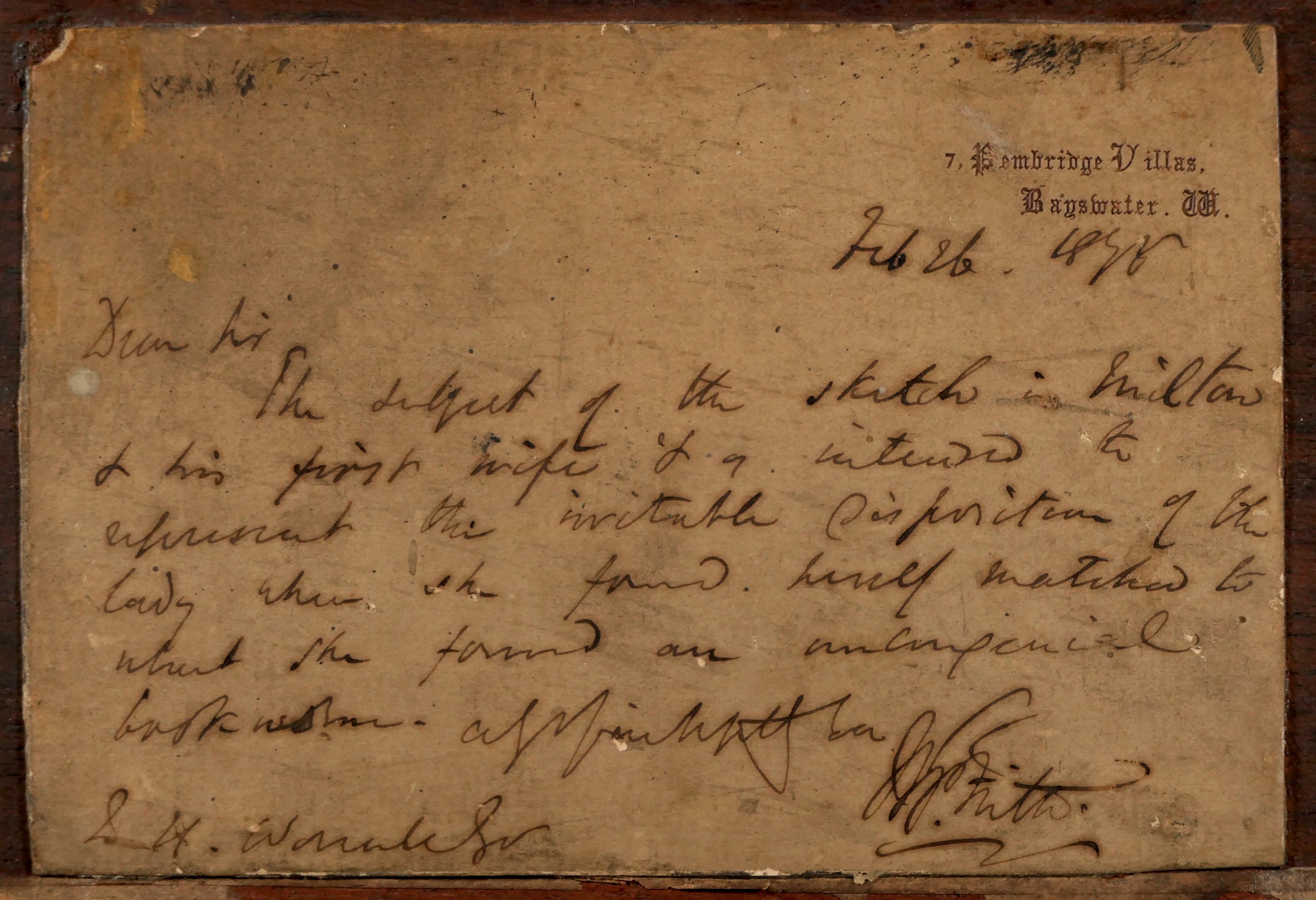 Signed and dated 1853. Letter on back of panel reads: "7, Pembridge Villas, Bayswater, W.", dated "Feb 26. 1898", reads "Dear Sir, The subject of the sketch is Milton & his first wife & is intended to represent the irritable disposition of the lady when she found herself matched to what she found an uncongenial bookworm. Faithfully Yours W. P Frith. S(?) H. Wonale(?) Esq."