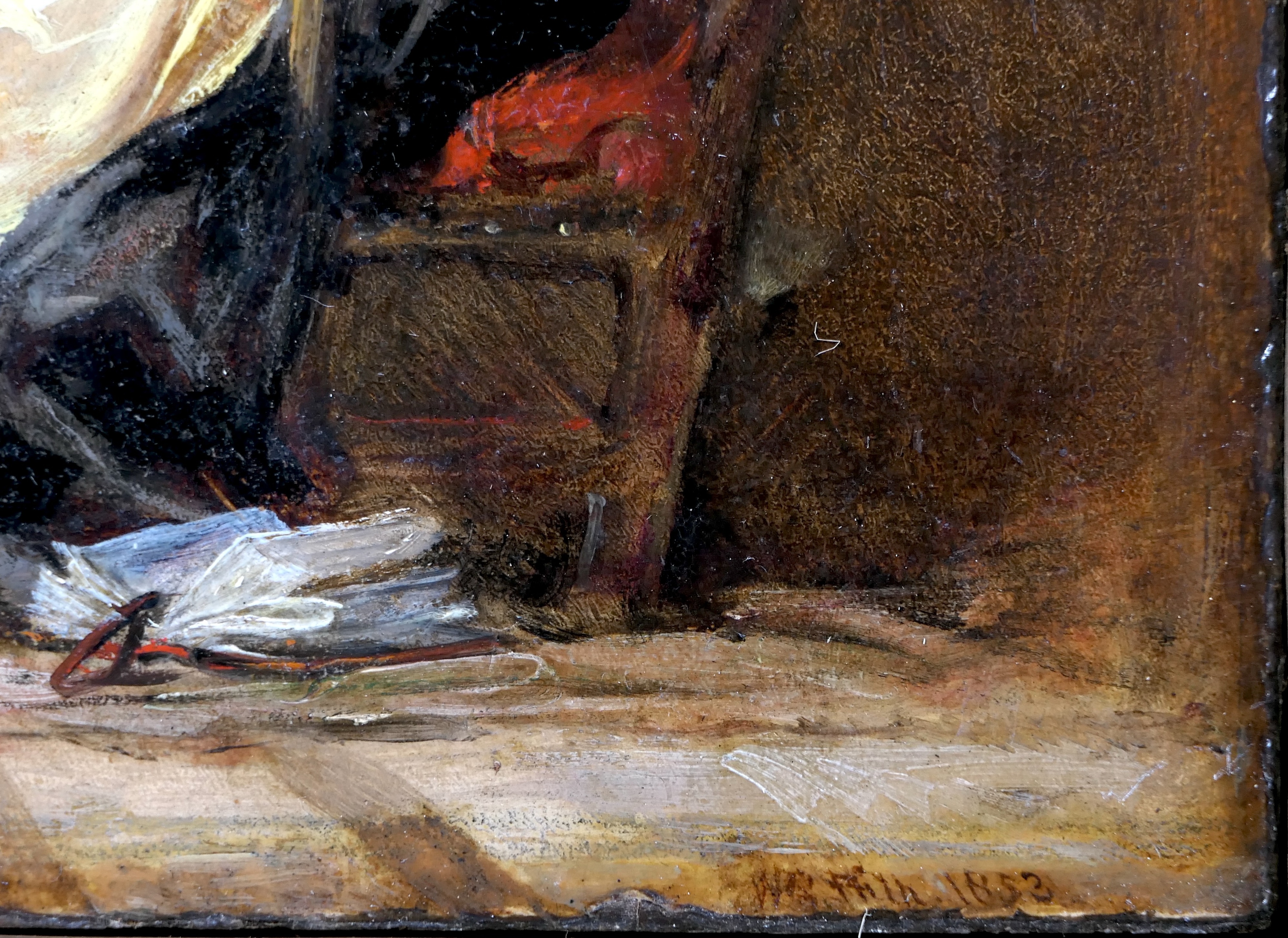 In this jewel-like panel painting, Frith tells us a story that reflects the turbulent history of 17th century England. On the face of it we might think that the letter Frith wrote to the then owner of the painting in 1898, 45 years after he painted the work, and which is attached to the back of the panel, tells the whole story: 'Dear Sir, The subject of the sketch is Milton & his first wife & is intended to represent the irritable disposition of the lady when she found herself matched to what she found an uncongenial bookworm. Faithfully Yours W. P Frith'.
