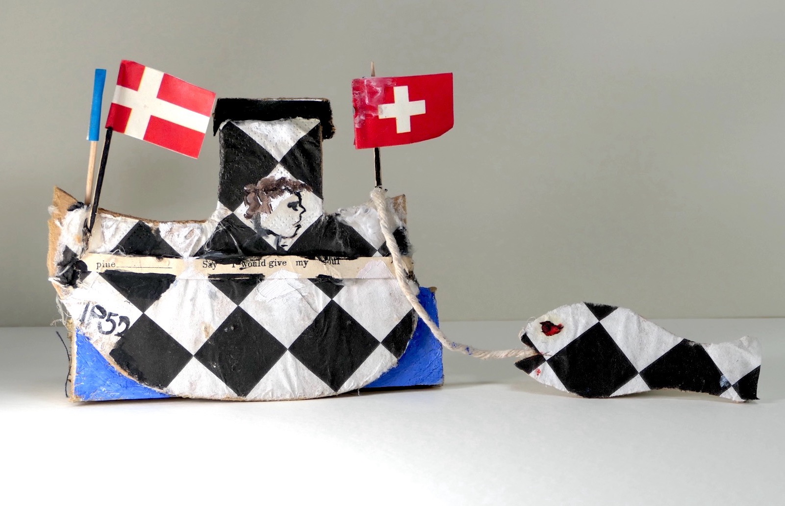 Tessa Newcomb made a number of these charming painted driftwood and collage fishing boats to sell to raise pocket money for her children. This one unusually features a large chequed fish being towed by the boat. As usual the boat is identified by an IP registration number. At the time Newcomb lived by the coast at Southwold. Her partner's mother, Margaret Mellis, who had lived in same house, collected driftwood from the neighbouring beach to make her driftwood sculptures.