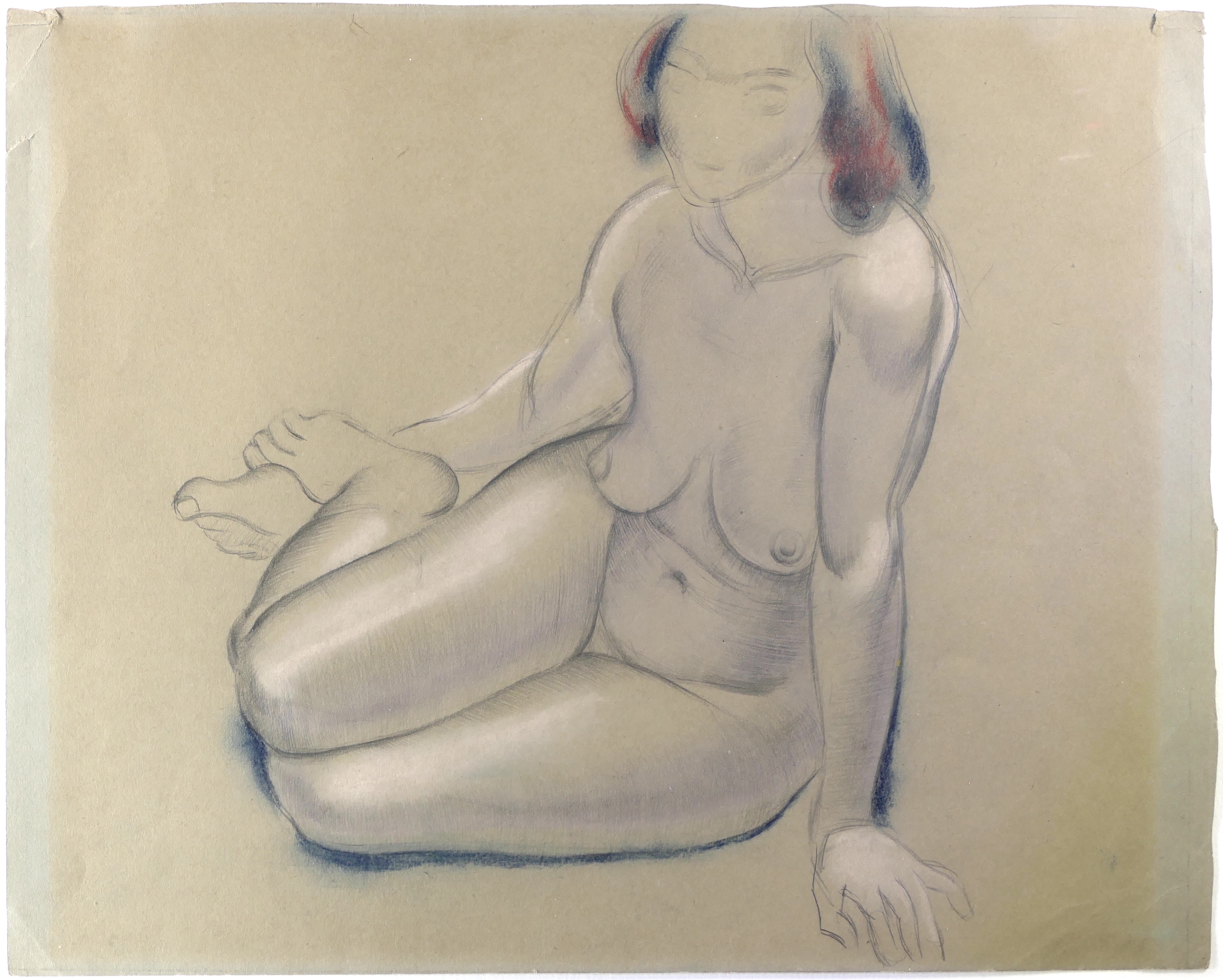 In the years after World War I, Dobson was briefly an exhibitor with Wyndham Lewis's Group X and influenced by earlier Vorticist art. At least two other surviving drawings from 1919-20, and sculptures made in the 1920s, depict female and male models seated on the floor, supporting themselves on one arm, and further drawings exploring such poses were again made in around 1941. Elements of the model's pose in this drawing are echoed in several sculptures of the 1920s, such as Susanna (1922-4), Seated Torso (1923), Woman Seated (c.1926), Reclining Nude Figure (c.1928) and, perhaps most closely, Woman Waking (c.1925) and Truth (1930). The locked arm enabled him to capture the musculature of this limb against the softer forms of the female model or the muscular body of his male model.