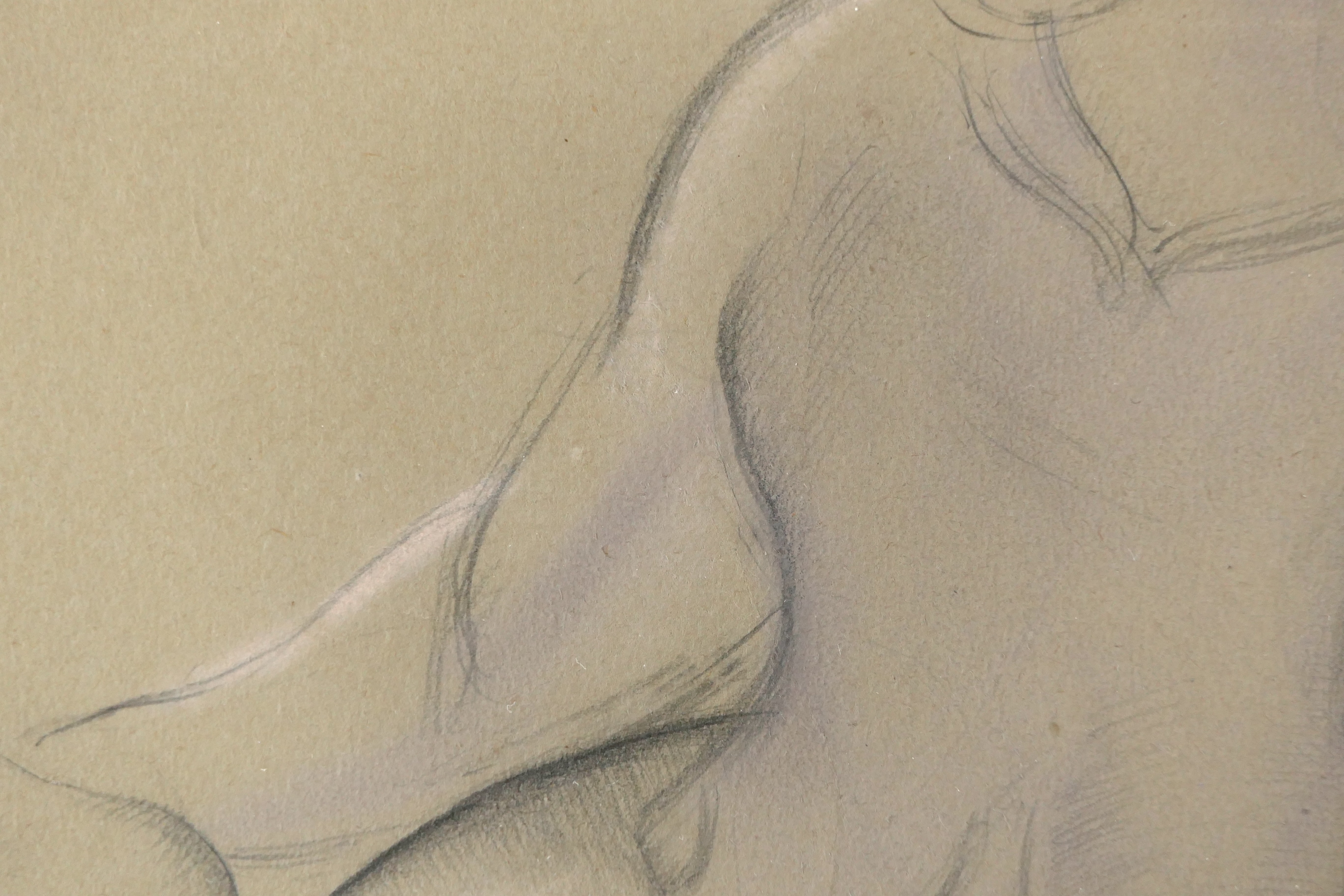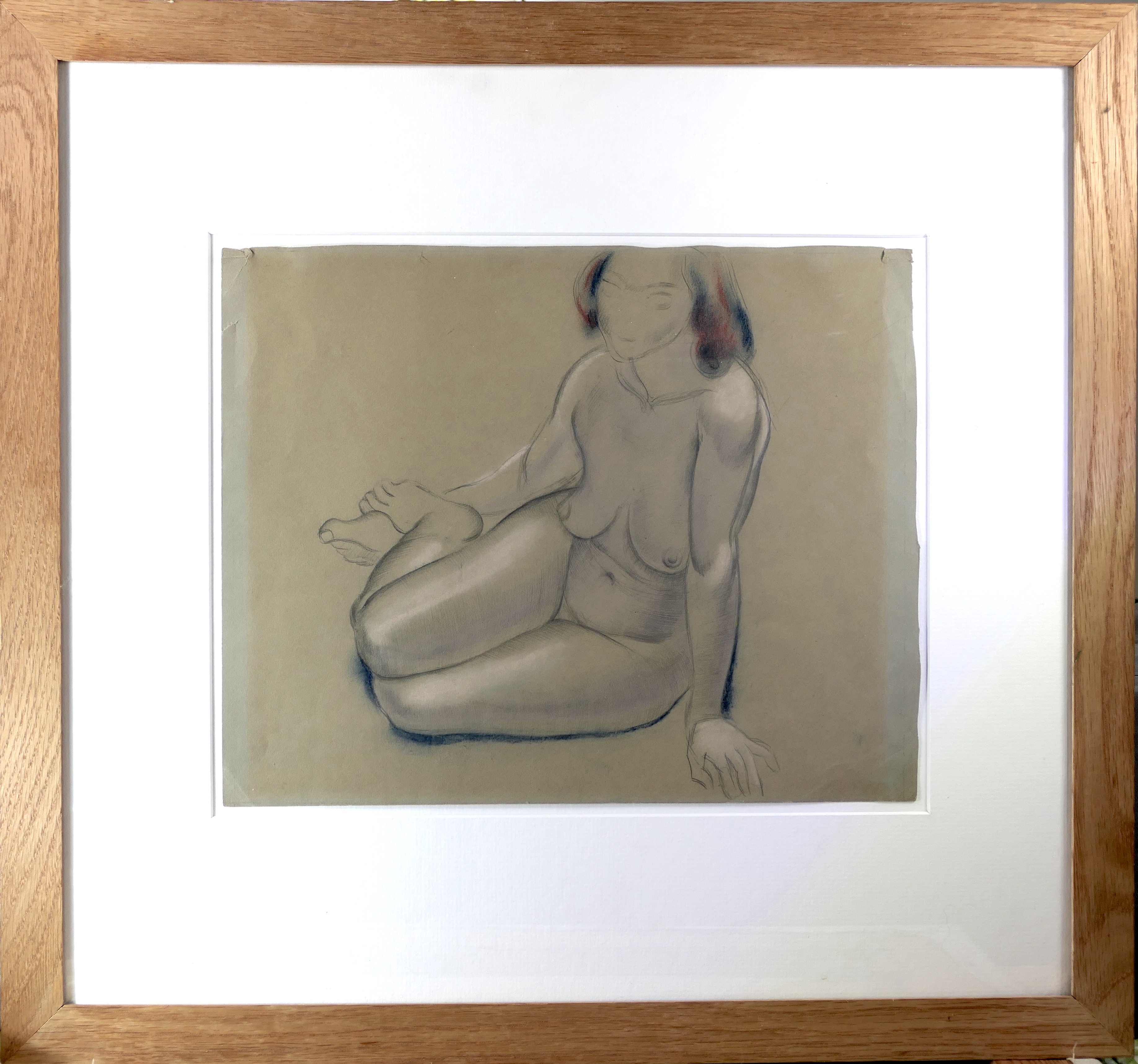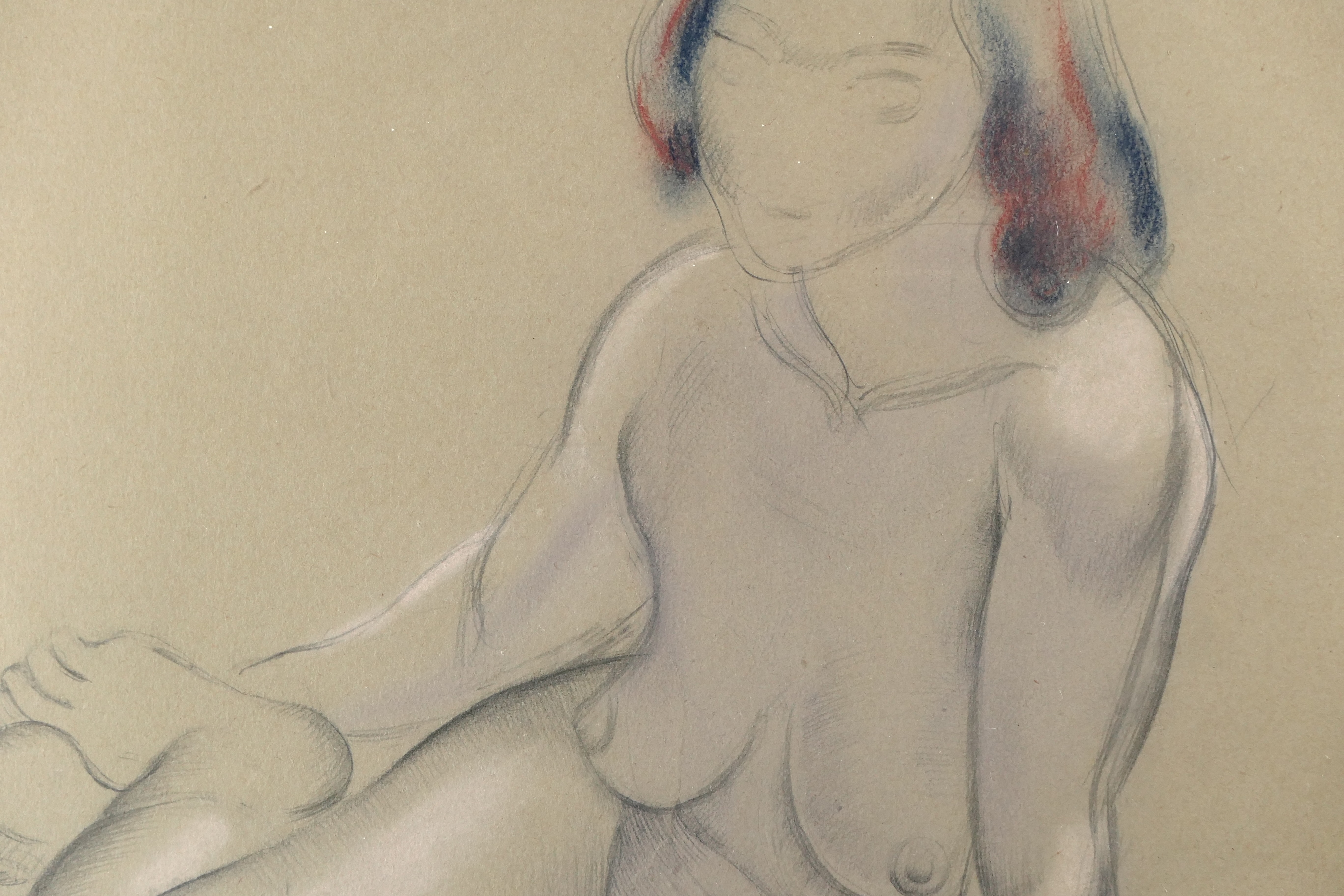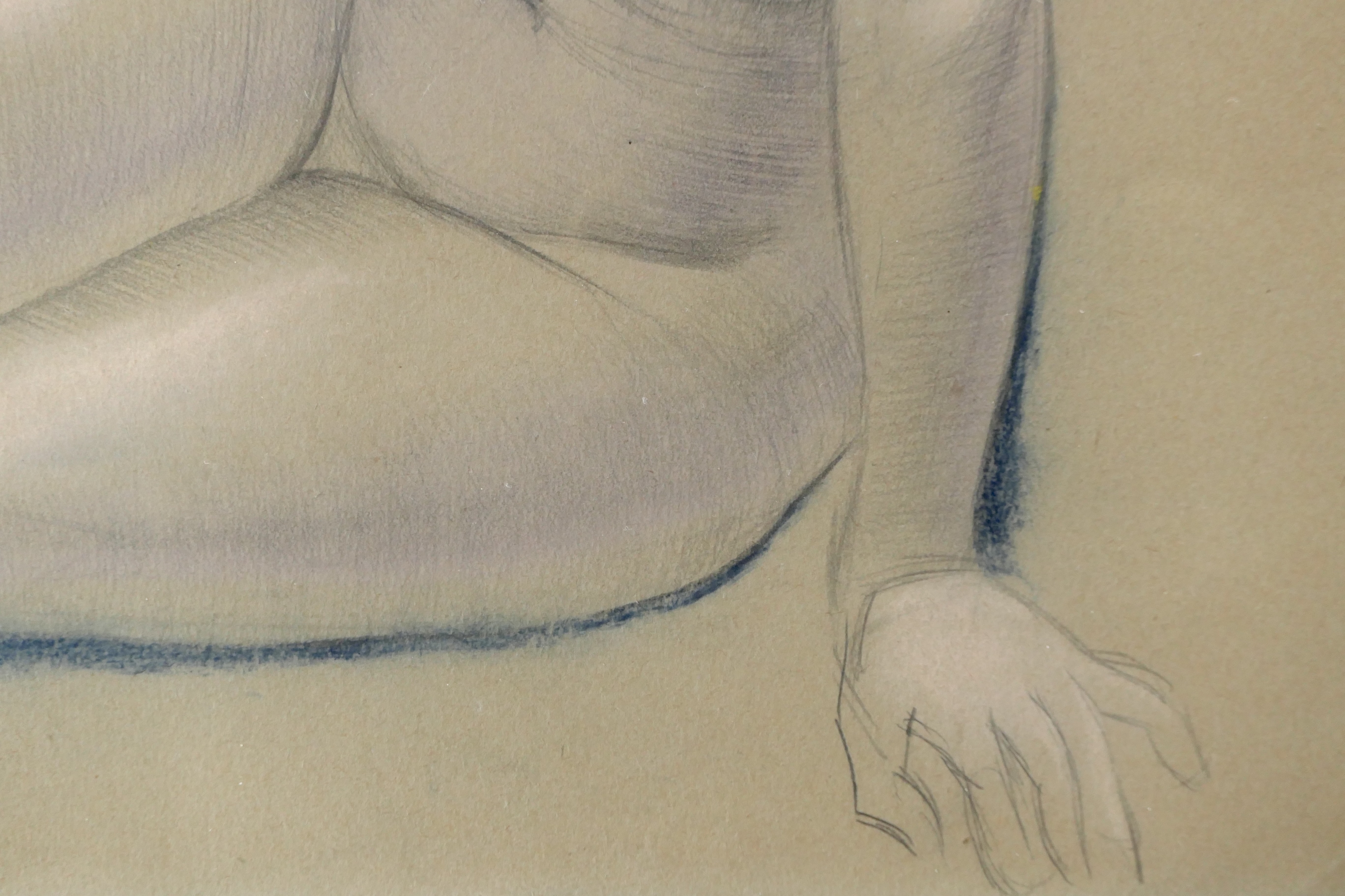 In 1920, Dobson met Wyndham Lewis, who was forming the short-lived GroupX in an attempt to revive the pre-war Vorticism movement. Dobson exhibited as a member of the group in its show at the Mansard Gallery, in Heal's department store, from 27 March to 24 April that year. Other exhibitors included Lewis, Etchells, Ginner, Dismorr and Wadsworth. Much of Dobson's early work on paper was destroyed when his Chelsea studio was bombed in the Blitz. Fairly subtle and subdued compared with his later, and more vivid drawings, this study is beautifully observed and modelled with a sculptor's eye, and drawn with the artist's assured, descriptive outline. It is also, in the most part, highly finished: before 1920, Dobson's drawings were largely created as an end in themselves, rather than as studies for sculpture, like most of his later works on paper. His first solo exhibition, at the Leicester Galleries in November 1921, included eight drawings described as nude studies.
