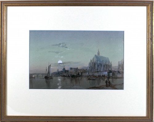In his progress to the third state the engraver had re-positioned and made the ‘H’ smaller, amended the lettering below the image and adds the dimensions of the oil painting, as well as carrying out Turner’s instructions for changes to the images. Having pulled this proof it was clearly decided to include more highlights in the foreground, which are to be seen in state iii. The proof is thus significant in helping reveal the working processes of the artist and engraver, feeling their way to the third state for publication. The paper used, which Turner chose as the best available for the etching and mezzotint processes, was Dovecote watermarked Auvergne 1742 laid paper made by the French mill of T. Dupuy (see photograph). The paper has been cut on slant beneath the plate mark, indication the sheet used was an off cut for proofing purpose rather than publication. and probably unique. Certainly, no other example of this state has yet been identified in museum collections. As such it is an interesting illustration of how artist and engraver worked together on one of the most significant of the early Liber plates, to achieve the finished print for publication.