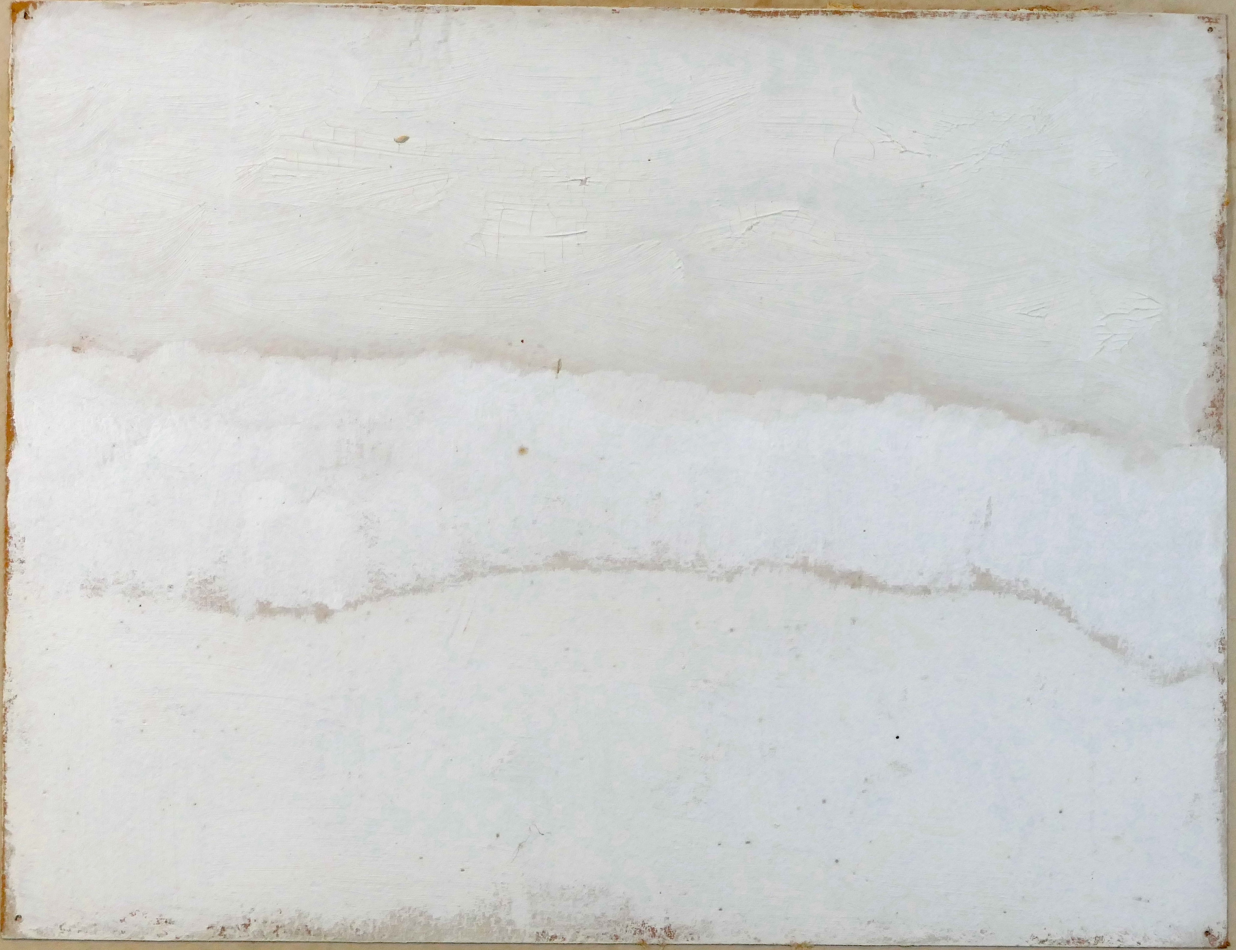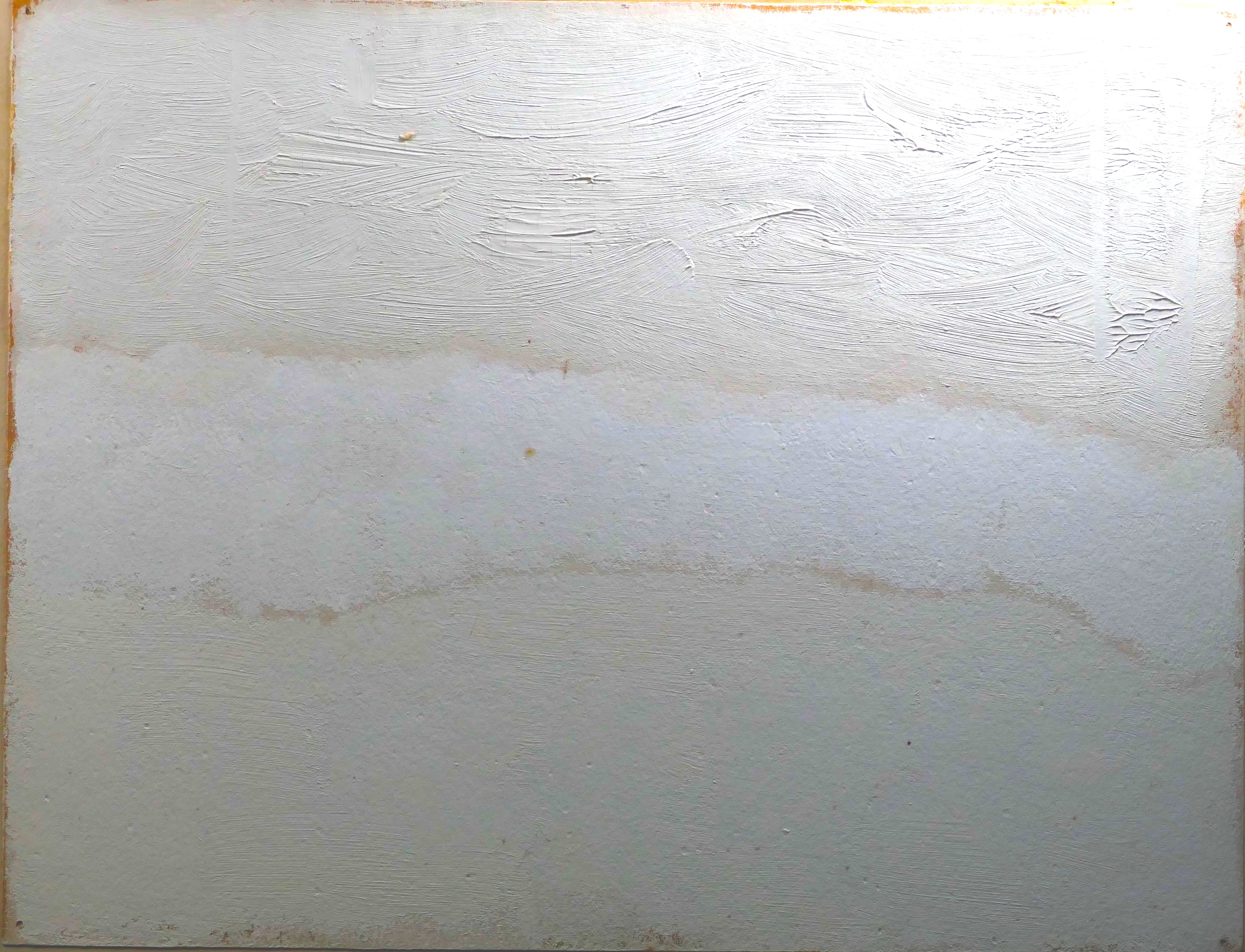 Although it may be unintentional, it is possible to interpret the present work as a snow-bound landscape, with the upper layer in oils representing the sky, the middle, perhaps gouache, layer indicating distant hills, and the lower, perhaps acrylic layer, closer ground. On close inspection, and under differing light conditions, the subtle colour variations in the three whites are complex and striking.