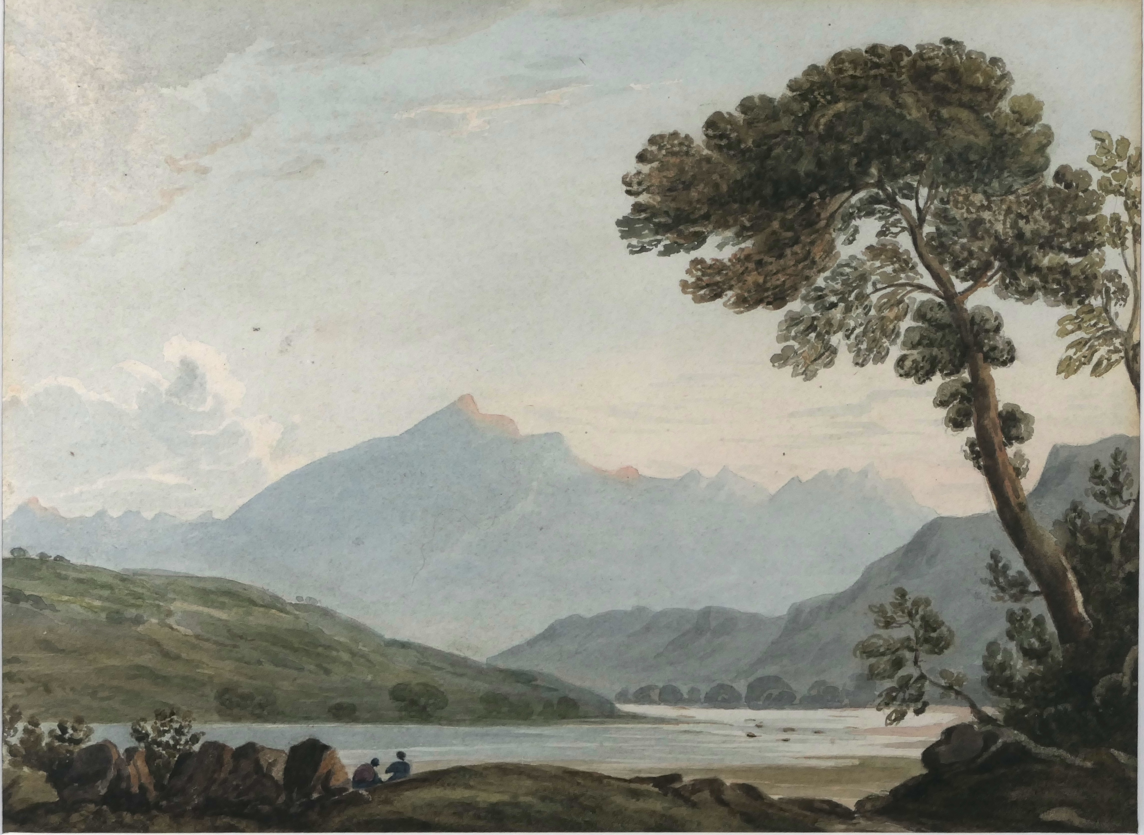 This tranquil view of one of Varley's favourite sublime subjects, Yr Wyddfa, known as Mount Snowdon, was taken from the south, across Afon Dwyryd. In search of sublime and picturesque scenery, Varley visited North Wales in 1798/9 and 1802, and North Wales landscapes are predominant in his early work, as he emerged out of Thomas Girtin's influence. Although he continued to paint such views across his career, the present, simply observed work, retaining most of its original colour and freshness, would seem from its handling and direct topography, to date from not long after his North Wales trips.