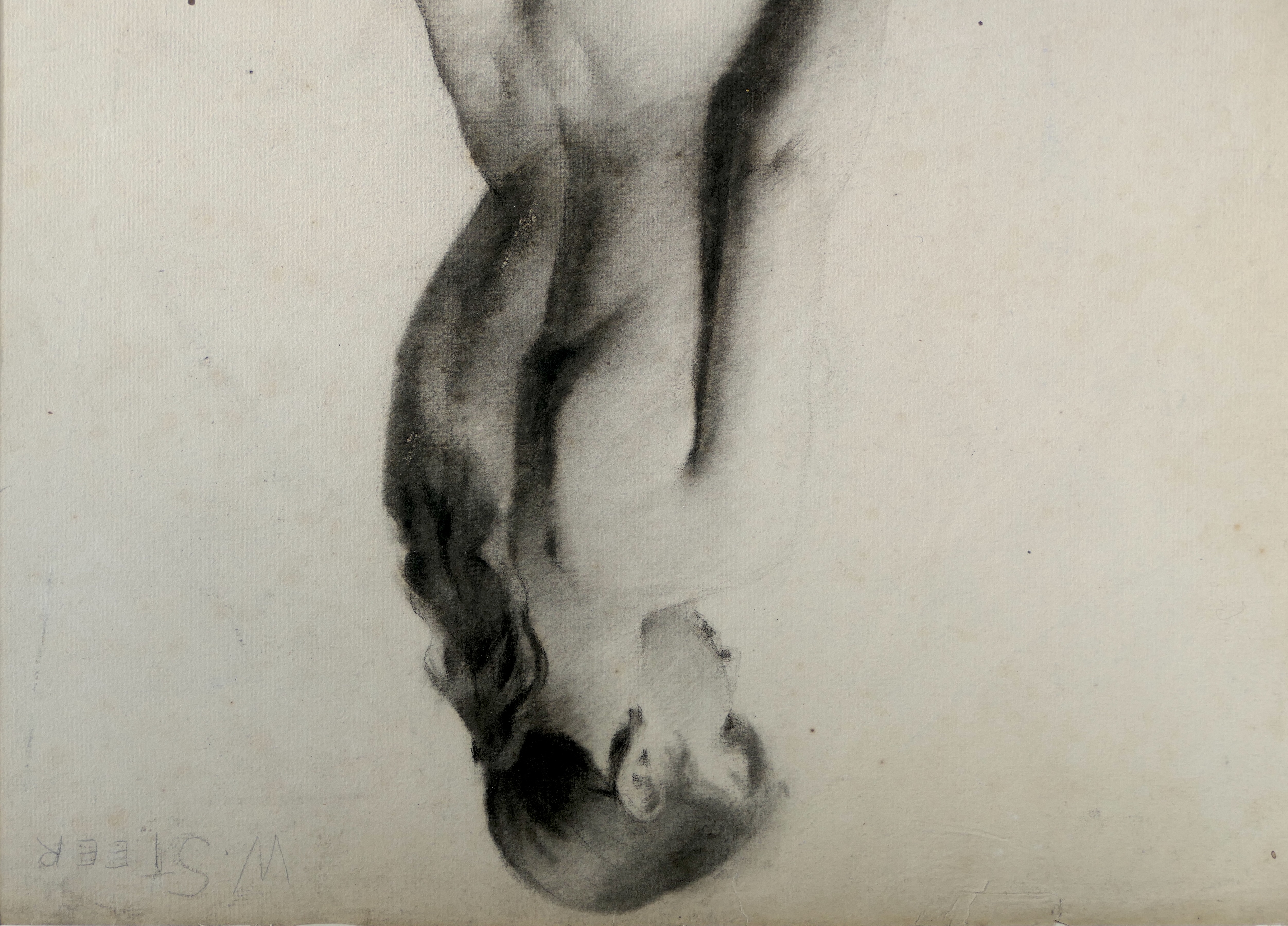 The ‘W STEER’ inscription to the upper right would appear to have been written over the original, similar but rubbed charcoal signature. As Bruce Laughton writes in his monograph on the artist, he was commonly known as ‘Wilson Steer’, without the Philip, when a young artist, and signed such pictures as ‘What of the War’(1883) ‘, with P. Wilson Steer’. He was also in the habit of signing in capital letters, for example, ’Tired Out’ of 1885. The Salson Naturalists, whom Steer and his young colleagues admire, also were in the habit of capitalising their signatures. However, the main reason for capitalisation in the present work may have been for ease of identification among all the other studies in the life room, or as a label if it was to be hung on the atelier wall, which was the practice for selected drawings.
