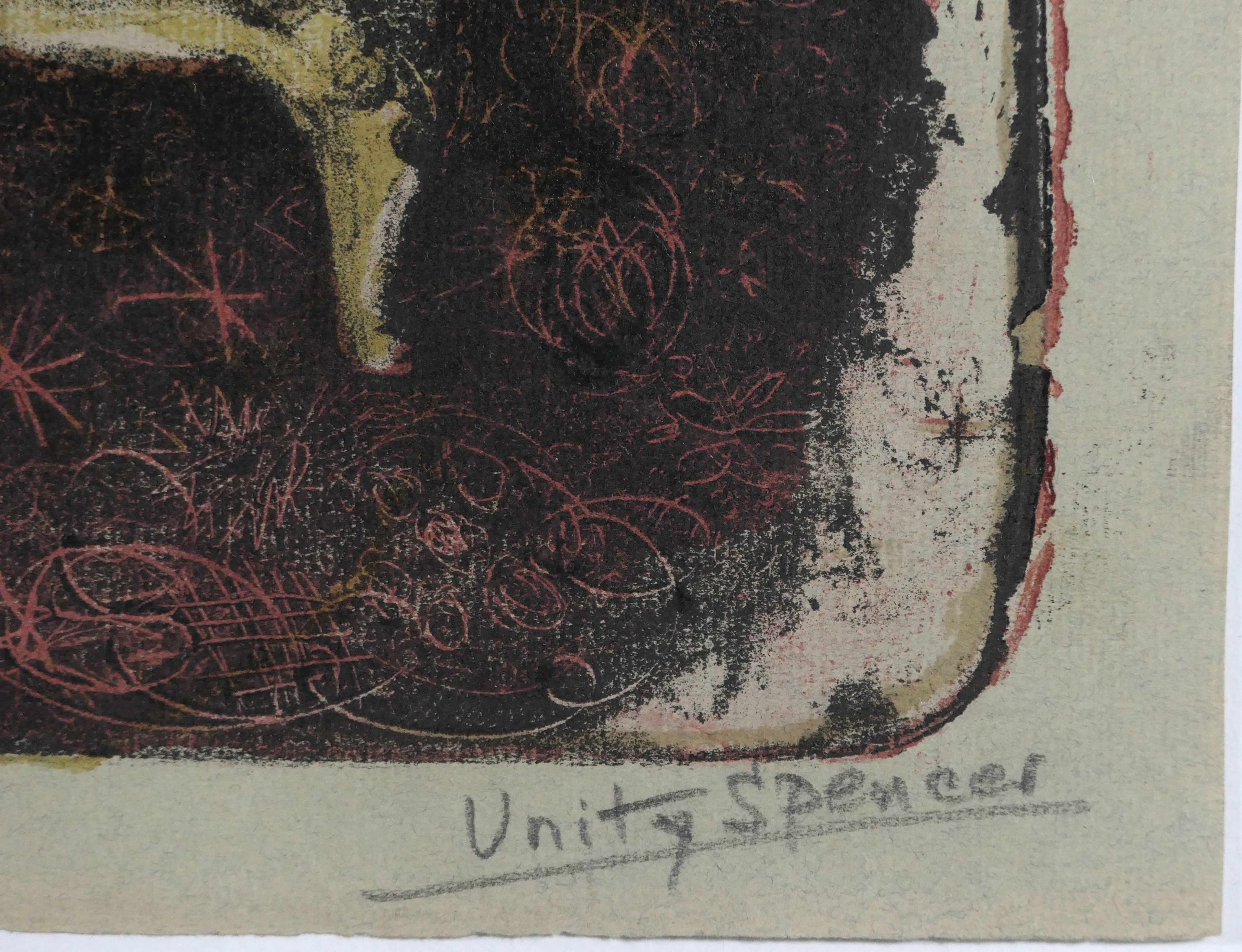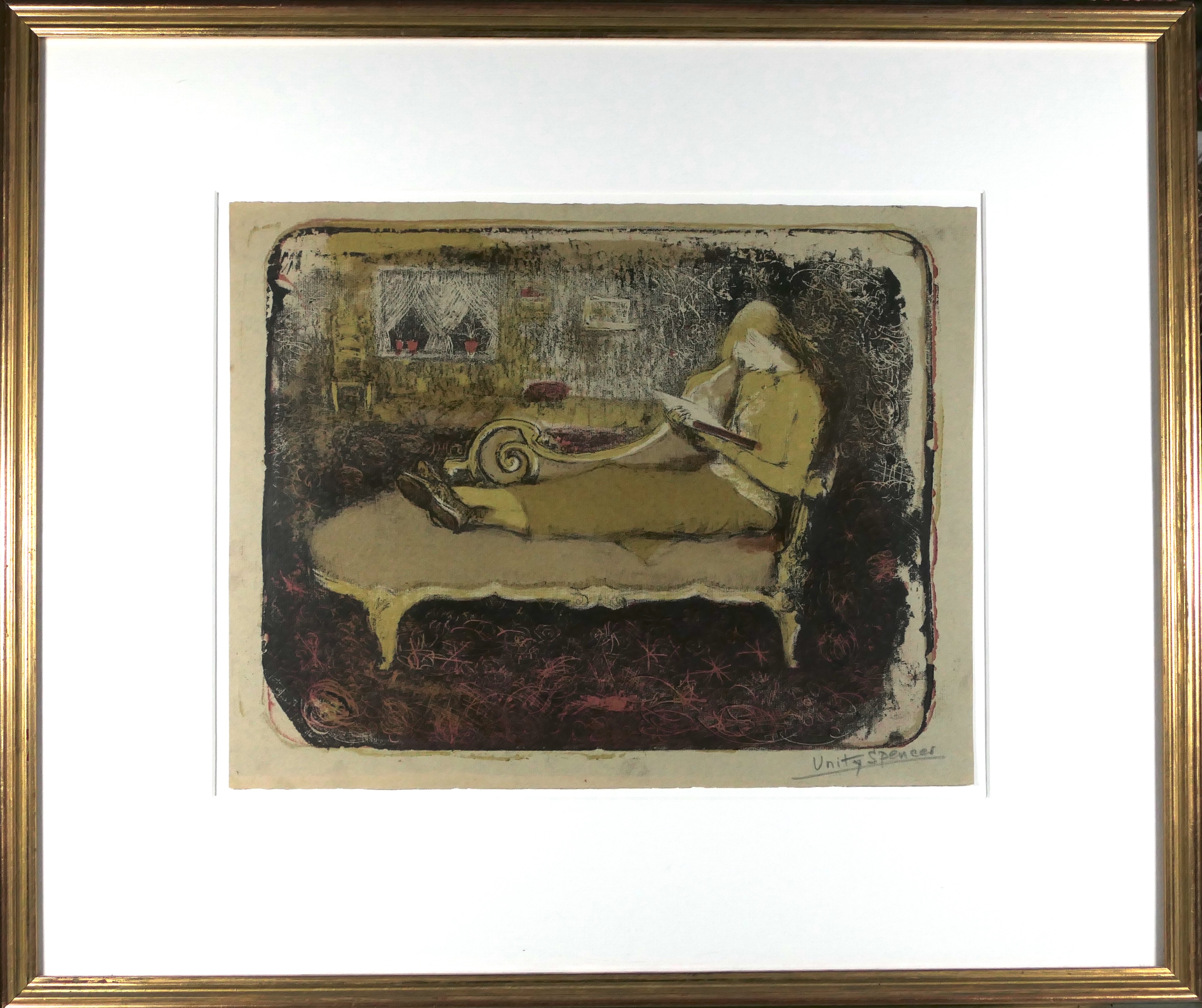 This lovely, richly coloured lithograph is one of a number which Unity Spencer made over her career. This would seem to show one of her fellow Slade students, who also features in the 1952 etching 'Slade Students', with a view across a perhaps shared room in digs in London, towards a mattress on the floor, a ladder-back chair and pot plants on a windowsill. Such lithographs, made on limestone by the artist, are rare to the market and may well have been unique. This one certainly has no evidence of an edition and has the feel of a mono print.